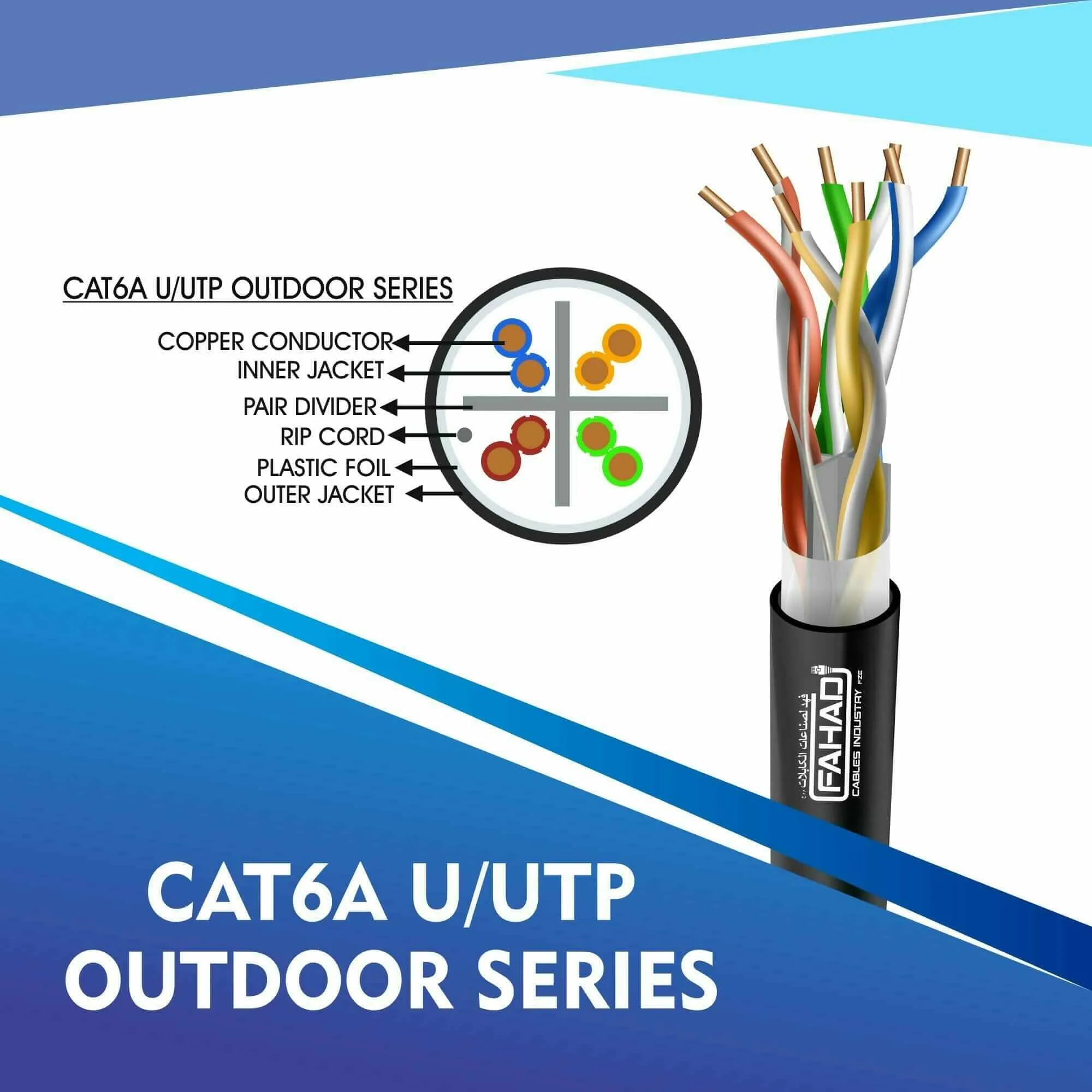 FAHAD CABLES cat 6a outdoor cable Black network 23 awg 4 pair 305m are Manufactured Tested and Complied with ANSI/TIA/568.2-D CENELEC EN 50288-5IEC 61156-5 (ISO/IEC-11801 Class -Ea). Cat6a Series is Designed to Ensure the Highest levels of performance, reliability, and longevity, and are ideal for large enterprise and small business.