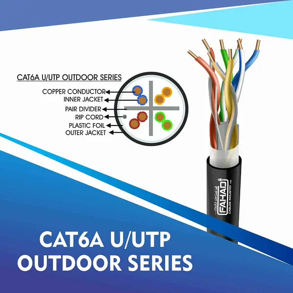 FAHAD CABLES cat 6a outdoor cable Black network 23 awg 4 pair 305m are Manufactured Tested and Complied with ANSI/TIA/568.2-D CENELEC EN 50288-5IEC 61156-5 (ISO/IEC-11801 Class -Ea). Cat6a Series is Designed to Ensure the Highest levels of performance, reliability, and longevity, and are ideal for large enterprise and small business.