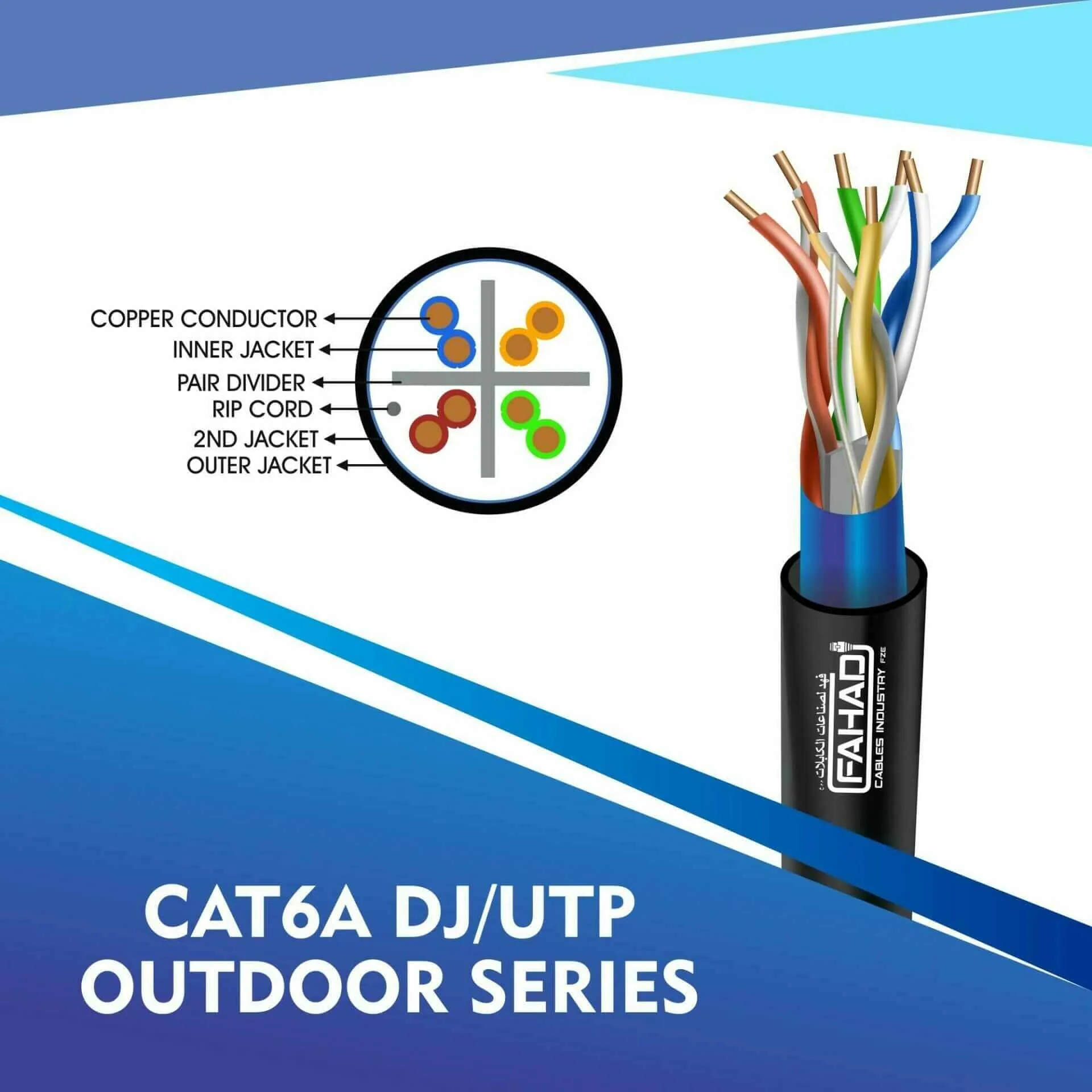 FAHAD CABLES double Jacket cat6a utp outdoor cable 305m are Manufactured Tested and Complied with ANSI/TIA/568.2-D CENELEC EN 50288-5IEC 61156-5 (ISO/IEC-11801 Class -Ea). Cat6a Series is Designed to Ensure the Highest levels of performance, reliability, and longevity, and are ideal for large enterprise and small business.cat6a u-utp outdoor double Jacket cable 305m
