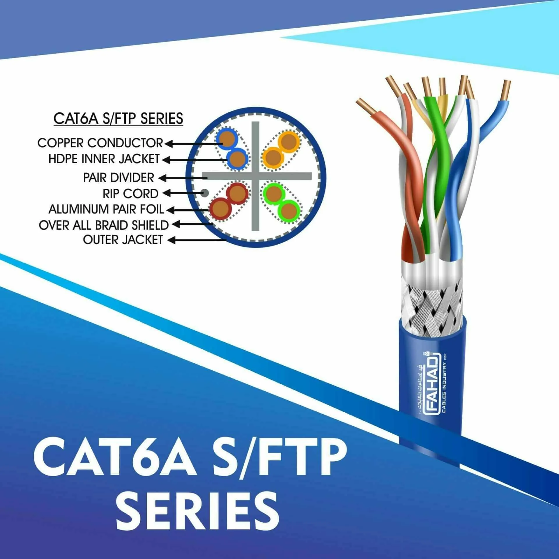FAHAD CABLES Explore the benefits of Cat6 and Cat6a S/FTP network cables from Fahad Cables Industry, designed for optimal performance in both personal and professional settings. These cables support gigabit speeds and feature a shielded foiled twisted pair design that minimizes interference and crosstalk. With high-quality LSZH and PVC jackets, they provide safety during fire incidents, making them suitable for various environments, including indoor setups. If you’re considering an upgrade to your network infrastructure, Cat6 and Cat6a cables offer the reliability and performance needed for today’s digital demands. Make a smart investment in your connectivity solutions today!sftp network cable cat6a LSZH 305m