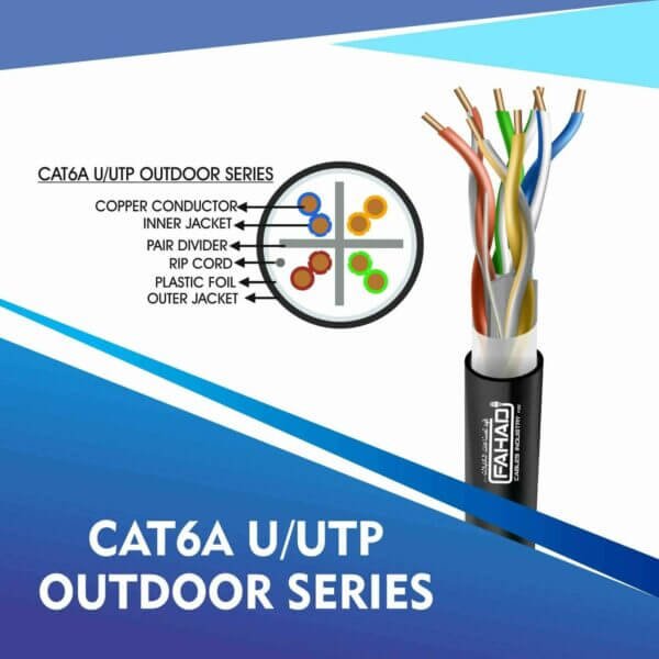 FAHAD CABLES cat. 6a 23 awg utp outdoor cable 305m are Manufactured Tested and Complied with ANSI/TIA/568.2-D CENELEC EN 50288-5IEC 61156-5 (ISO/IEC-11801 Class -Ea). Cat6a Series is Designed to Ensure the Highest levels of performance, reliability, and longevity, and are ideal for large enterprise and small business.cat6a 23awg u-utp outdoor cable 305m