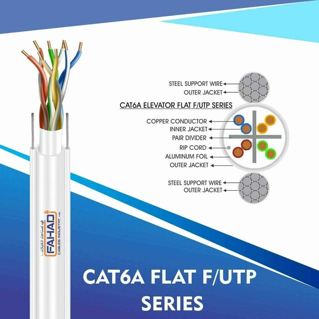 FAHAD CABLES Cat6a f/utp Elevator Flat Cable 23 awg 4 pair 305m are Manufactured Tested and Complied with ANSI/TIA/568.2-D CENELEC EN 50288-5IEC 61156-5 (ISO/IEC-11801 Class -Ea). Cat6a Series is Designed to Ensure the Highest levels of performance, reliability, and longevity, and are ideal for large enterprise and small business.cat6a elevator travelling flat f-utp 23awg 4 twisted pair network cable