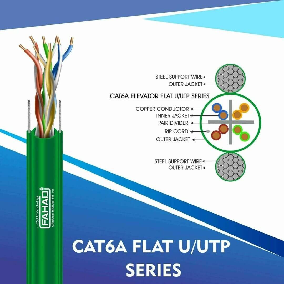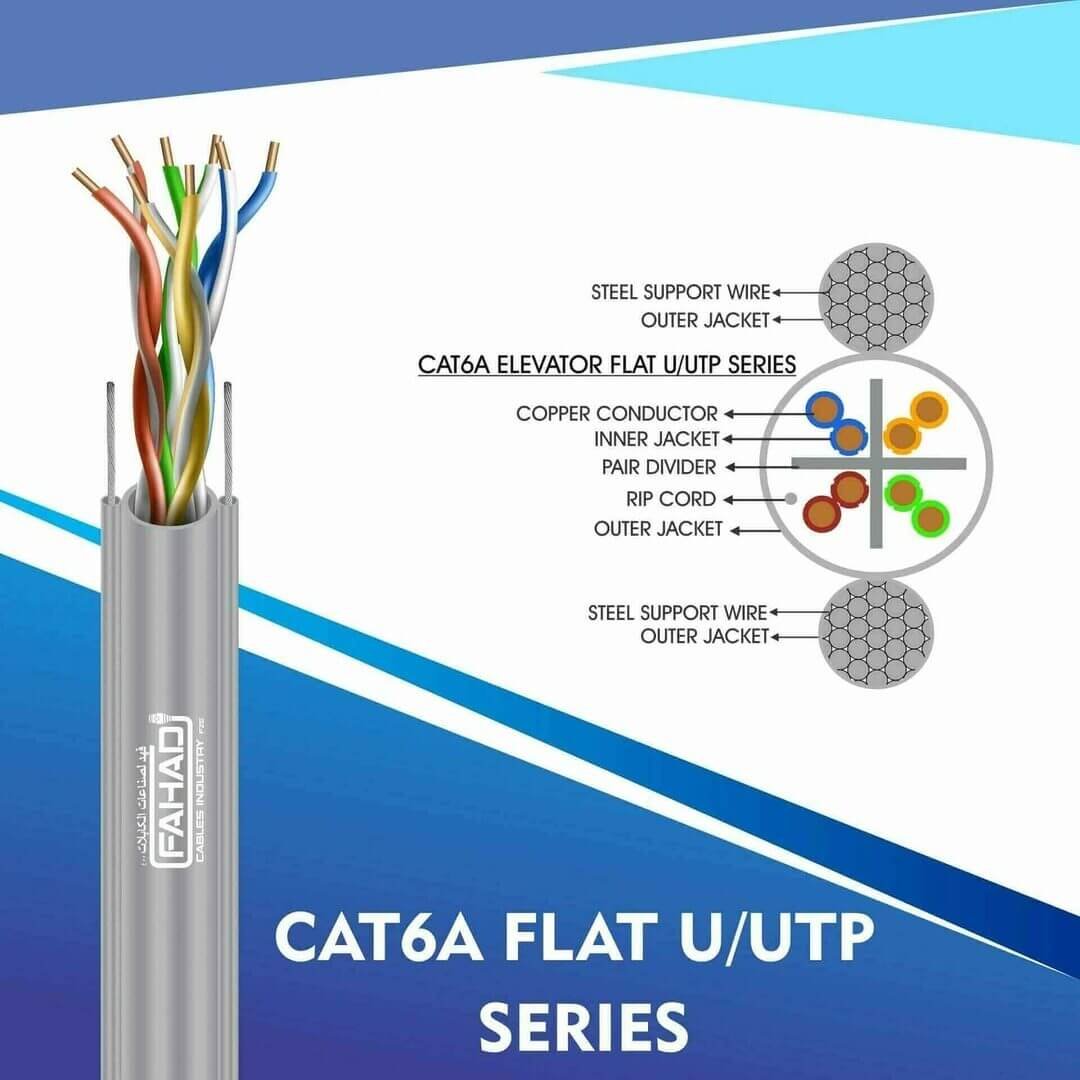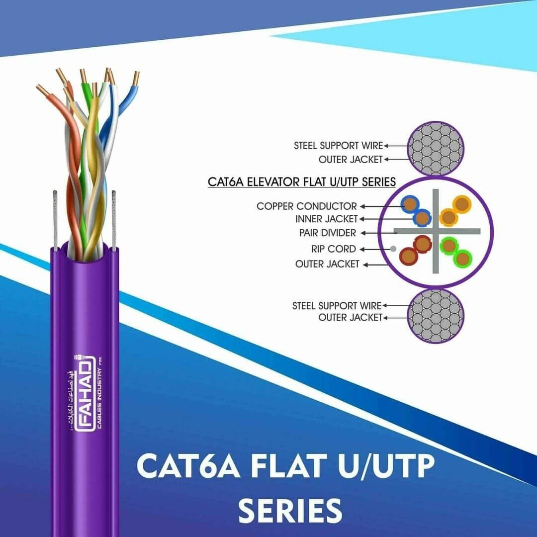 FAHAD CABLES Cat6a u/utp Elevator Flat Cable 23 awg 4 pair 305m are Manufactured Tested and Complied with ANSI/TIA/568.2-D CENELEC EN 50288-5IEC 61156-5 (ISO/IEC-11801 Class -Ea). Cat6a Series is Designed to Ensure the Highest levels of performance, reliability, and longevity, and are ideal for large enterprise and small business.
