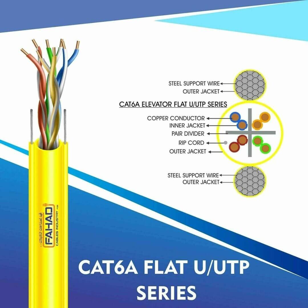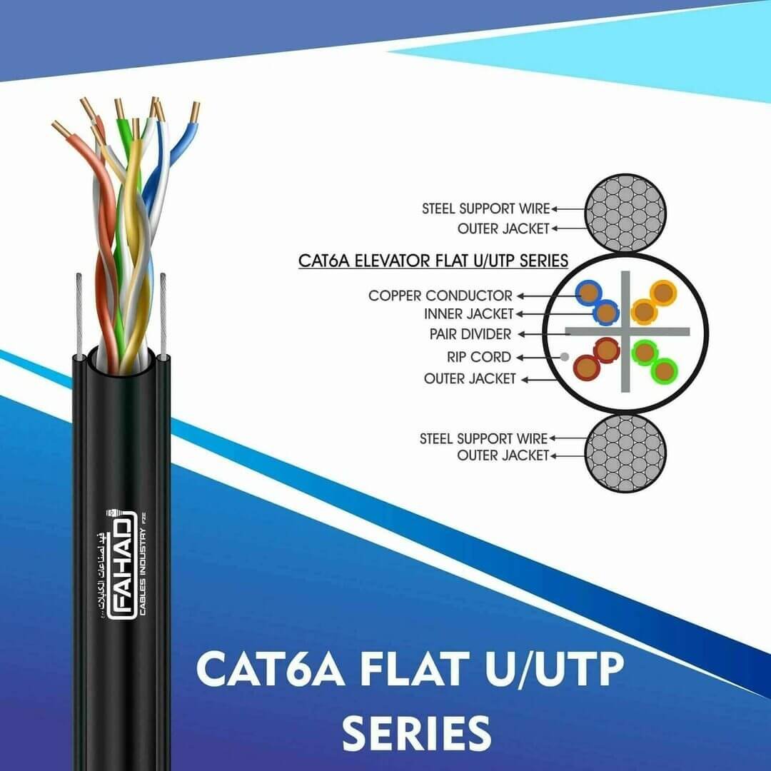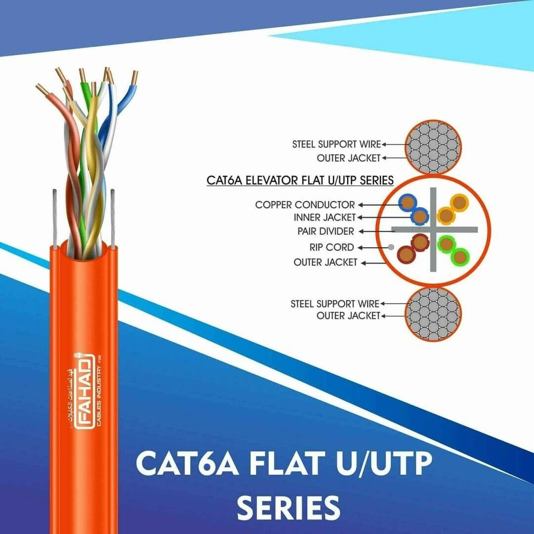 FAHAD CABLES Cat6a u/utp Elevator Flat Cable 23 awg 4 pair 305m are Manufactured Tested and Complied with ANSI/TIA/568.2-D CENELEC EN 50288-5IEC 61156-5 (ISO/IEC-11801 Class -Ea). Cat6a Series is Designed to Ensure the Highest levels of performance, reliability, and longevity, and are ideal for large enterprise and small business.