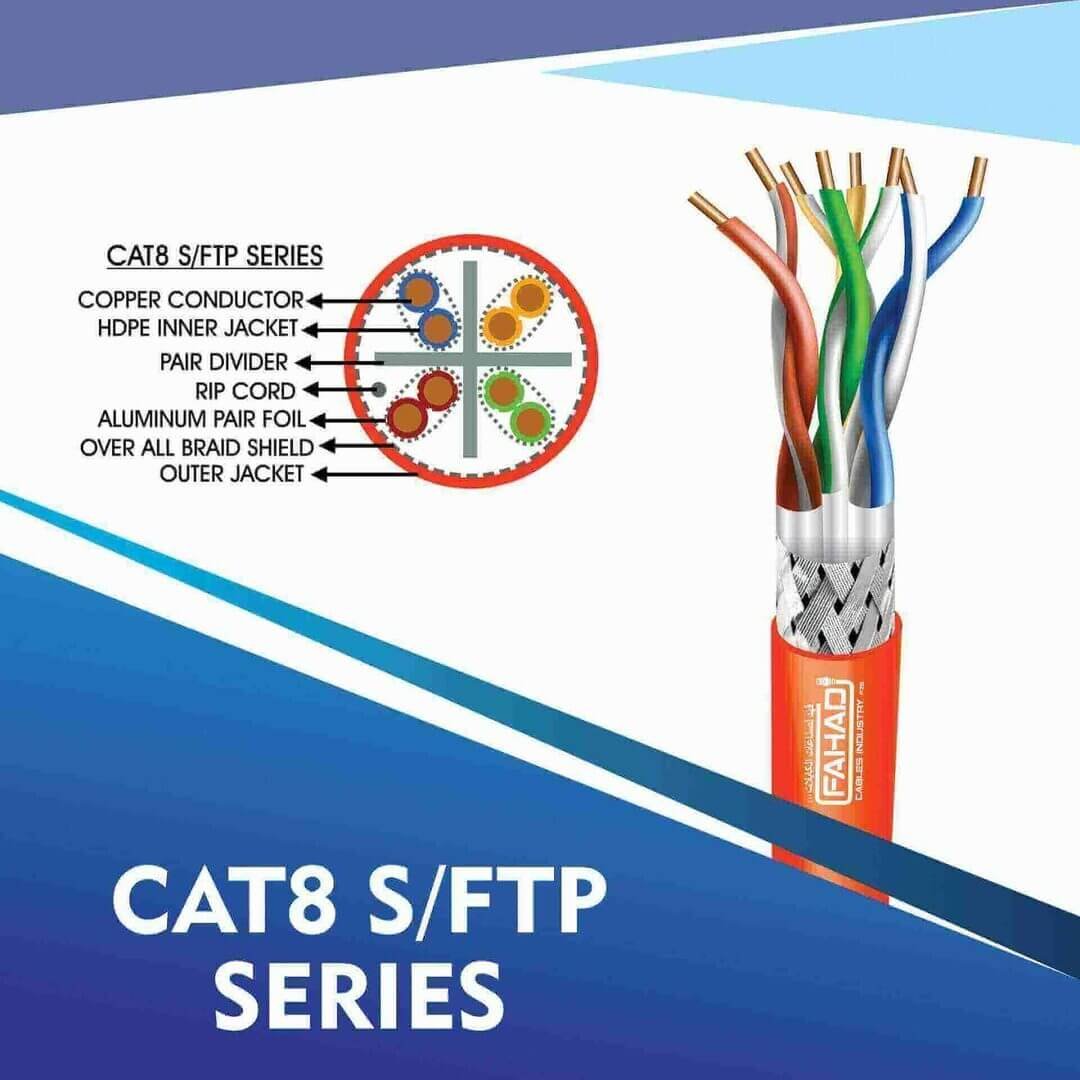 The Fahad Cable Cat8 Network Cable is a high-performance networking solution designed for demanding data transmission needs. Featuring 23AWG twisted pair conductors with S-FTP (Shielded Foiled Twisted Pair) construction, this cable ensures superior protection against electromagnetic interference and crosstalk. With a robust LSZH (Low Smoke Zero Halogen) jacket and a generous 305-meter length, it is ideal for professional installations requiring reliable, high-speed connectivity and enhanced safety in sensitive environments.